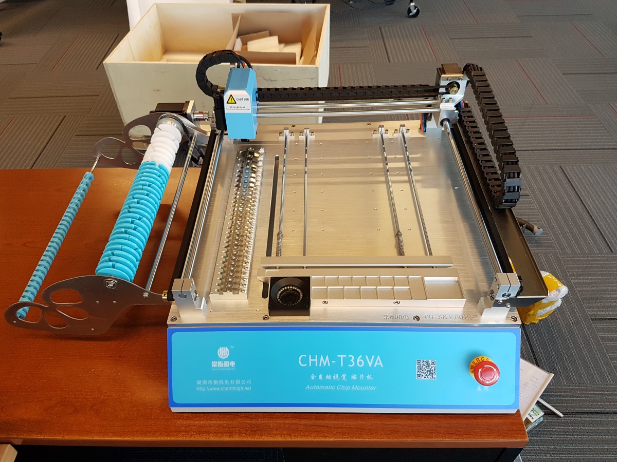 The CHMT36VA is a low-cost good accuracy two heads desktop-sized vision-based pick and place machine from Charmhigh. You can use it to produce a variety of designs, 50 to 100pcs at a shot. It works very well for low-volume high-mix pick and place of 0402 based designs.
